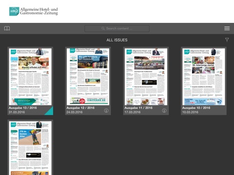 Die ahgz – Allgemeine Hotel- und Gastronomie-Zeitung auf dem iPad und iPhone: Deutschlands einzige Wochenzeitung für Hotellerie und Gastronomie schon donnerstags bequem auf dem Tablet oder Smartphone lesen. Die ahgz deckt alle wichtigen Informationskanäle ab und schafft so eine universelle Kommunikationsplattform für die Entscheider in der Hotellerie und Gastronomie. Neben der Wochenzeitung stehen den Lesern der tägliche Newsletter ahgz am morgen, ahgz.de als tagesaktuelles Online-Newsportal sowie das wöchentliche E-Paper als App und im Webviewer zur Verfügung.