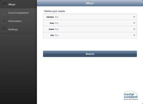 The Alloy Configurator provides valuable guidance and assistance in selecting the appropriate Ivoclar Vivadent alloy. Different criteria such as indication, composition, group and colour can be entered quickly and easily. The Configurator shows the alloys that match the criteria entered and displays detailed information about the individual search results. In addition, users can conduct cost comparisons between the different alloys to select the most cost-effective product. Numerous guidelines provide useful information about how to properly process the alloys.