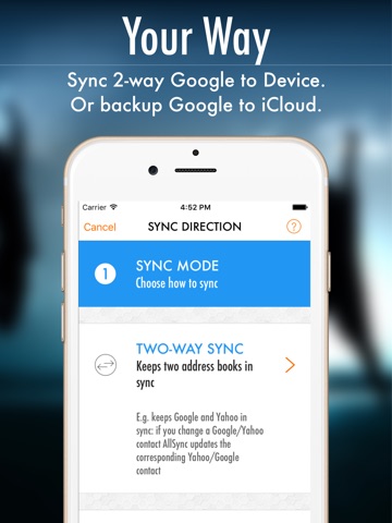 TWO-WAY SYNC keeps two address book in sync: e.g. keeps Google and Yahoo in sync: if you change a Google/Yahoo contact AllSync updates the corresponding Yahoo/Google contact.