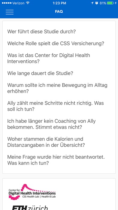 activity interventions using the MobileCoach (https://www.mobile-coach.eu/) platform. Ally is a chat based coaching platform, where the users receive customized step goals daily, and receive interventions based on whether they complete their goals or not, to help them keep track of and eventually increase their daily steps.