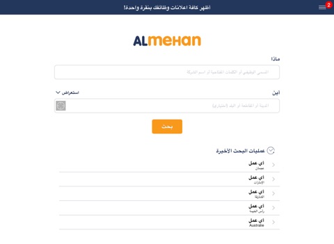 يمكن البحث عن وظيفة بشكل سهل سريع مع واجهة Almehan، مما يتيح لك الوصول إلى جميع خدمات Almehan مثل تحميل سيرتك الذاتية،وتخزين عمليات البحث المفضلة لديك و تخصيص تنبيهات عبر البريد الالكتروني.