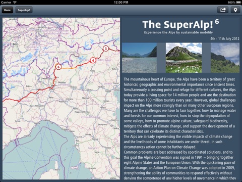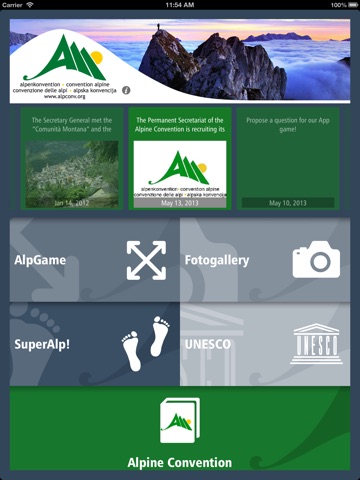 An innovative way to get to know the Alpine Convention, its activities and its official documents and be regularly informed about new developments. Follow on a friendly interface the itineraries of the different editions of SuperAlp! - the sustainable crossing of the Alps, or find out where the sites of the Unesco World Heritage are located in the alpine region. Looking for a challenge? Test your knowledge regarding the Alps with AlpGame!