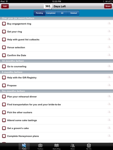 • Get help! Share your list with your BRIDE, BEST MAN, WEDDING PLANNER or anyone you wish via The Alpha Groom Sidekick App. – FREE! For a limited time only –