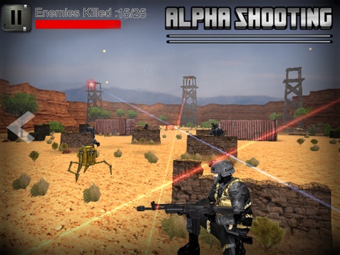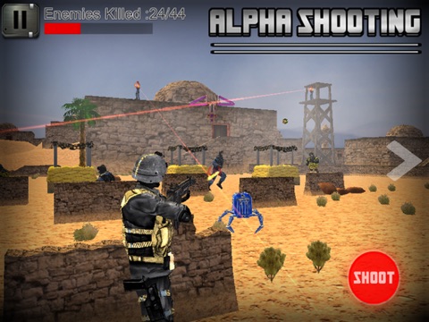 in which you play the role of a special forces operative tasked with carrying out various missions. Alpha Shooting features many missions in different locations across the world, taking place outdoor environments. Before a mission starts, the player can customize their weapon load-out to suit the given operation which presents you with different tactical objectives that you must finish,such as Ambushing Combatants, Destroying an enemies on towers, Assassinating a high-value target and Shooting Bots.