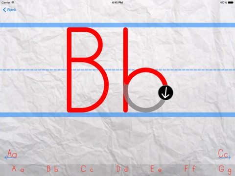 Users are allowed to select any letter and trace it along the given traceable guidelines. As the user traces, a the handle guides the user to let them know which way to go. Once the user completes the letter, an animation appears to let the user know they have successfully completed tracing the letter.
