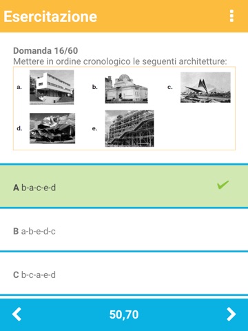 - simulazioni complete del test di ammissione ad Architettura (60 domande, di cui 20 di ragionamento logico, 16 di storia, 12 di matematica e fisica, 10 di disegno e rappresentazione, 2 di cultura generale), con statistiche immediate sul punteggio che hai totalizzato per ogni materia e numero di domande esatte, omesse ed errate