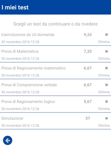 - “I Miei Test”, area personale che memorizza le esercitazioni e le simulazioni che stai svolgendo: potrai riprenderle e ultimarle in un secondo momento e rivedere le tue risposte, per tenere traccia dei tuoi miglioramenti o degli argomenti da ripassare