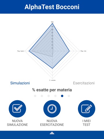 - simulazioni complete del test di ammissione allUniversità Bocconi (90 domande), con statistiche immediate sul punteggio che hai totalizzato per ogni materia e numero di domande esatte, omesse ed errate
