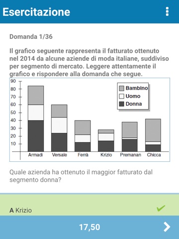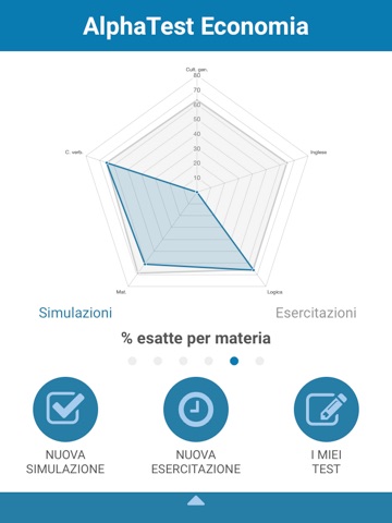 - simulazioni complete del test di ammissione al TOLC di Economia del CISIA (36 domande, di cui 13 di matematica, 13 di logica, 10 di comprensione verbale), con statistiche immediate sul punteggio che hai totalizzato per ogni materia e numero di domande esatte, omesse ed errate