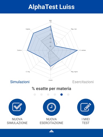 - simulazioni complete del test di ammissione all’Università LUISS (70 domande), con statistiche immediate sul punteggio che hai totalizzato per ogni materia e numero di domande esatte, omesse ed errate