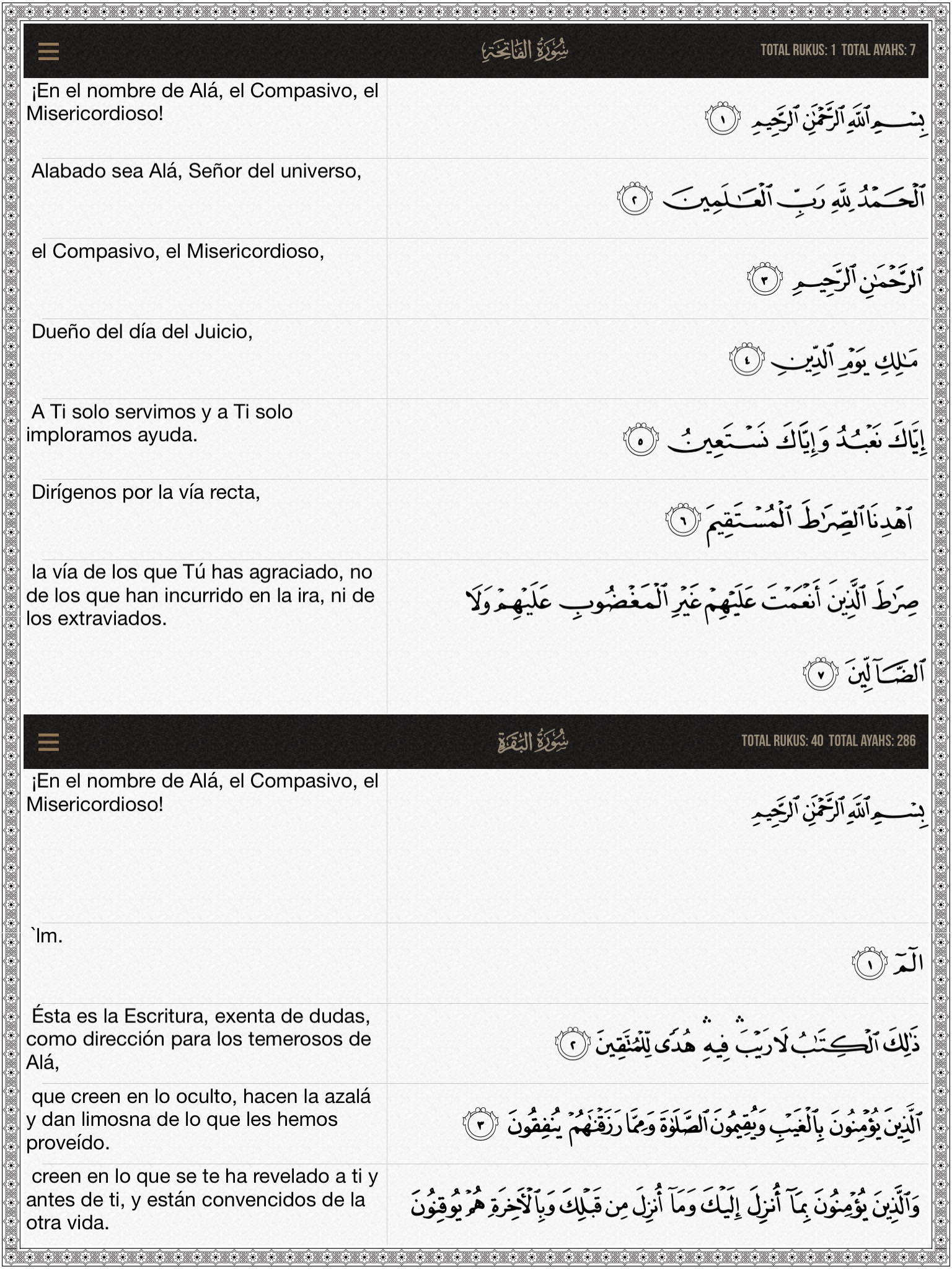 • AlQuran Spanish the ultimate translation of Quran in Spanish language (Muhammad Asad - Abdurrasak Pérez , Julio Cortes) and audio recitation from trusted sources. One application after which you do not need to download any other Quran App for Spanish translation.