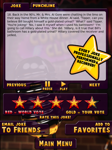 ★ Play each joke one at a time, or hook it up to the stereo and let Als Comedy Club become the life of the party (or flop horribly leaving you with even less friends then you already had, which will still be really funny, just not for you.)