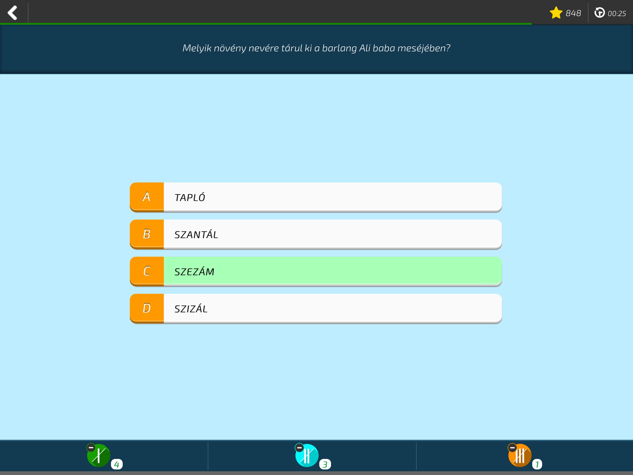 - több ezer érdekes kérdés 4 lehetséges válasszal. Minden kérdés egy helyes válasszal rendelkezik.