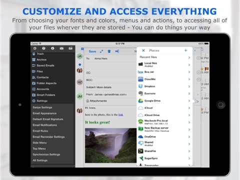Points positifs : excellente idée Enregistrement des pièces jointes Configuration des comptes très simple créations de dossiers et de mot de passe Fonction dimpression tris et filtres Points négatifs idée excellente mais réalisation moyenne Bug très souvent ( il faut deconnecter ou supprimer les comptes crées dans lapplication Mail native , ça améliore les choses mais cest dommage ) Très lente à lenvoi et à la reception des mails ( en wifi ) laffichage des mails et trop petit Rapport qualité/prix passable en létat Vite ! une grosse mise à jour pour devenir excellente