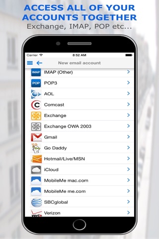 Supports practically every leading email type IMAP, Exchange, Outlook, POP, iCloud, Gmail, Hotmail, Yahoo, etc...