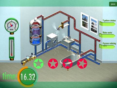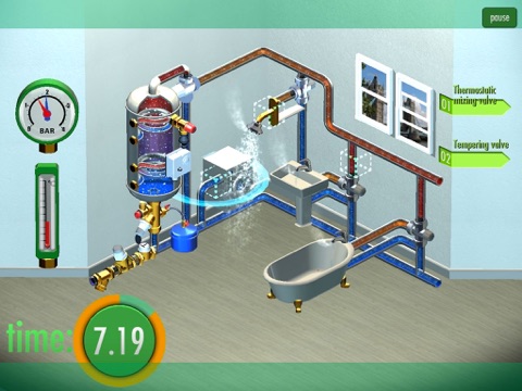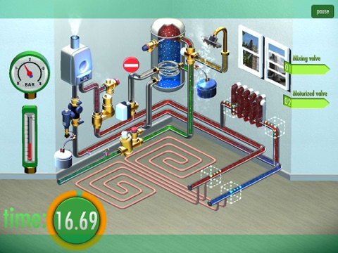 Heating equipment: At this level you will be presented with the schematic of a conventional heating system of the mixed type, i.e. one with radiators and infloor panels. Your job is to achieve correct operation of the system by fixing problems like the build-up of impurities and air in operating system. The safety devices will help you to control any overpressure and excessively high temperatures in the circuit. By using components for hydraulic separation and distribution, you help ensure efficient circulation of hot water in the circuits and achieve optimal comfort.