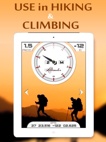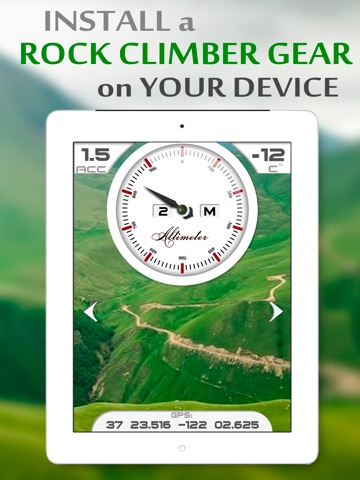 □ »» Find out at what height you are at the moment! □ »» Advanced technologies for the vertical navigation! □ »» Determining the current location in three-dimensional coordinates system! ►The Application Altimeter will transform your I-device into a device which will be able to find out at what altitude above sea level you are at the moment. The program reads the data sent by one satellite GPS and transforms them into a metric system and into a feet system. The point, in which is located your body, is localized in 3 coordinates: longitude, latitude and altitude. □□□ The Altimeter™ – is very useful for the tourists, amateur alpinists and extremist parachutists. The application is very useful in keeping the evidence of personal records and is a source of enthusiasm to conquer new heights. In addition, the application is easy to use as a measuring device for calculating the height of the buildings, trees or other elements from the natural landscape. A nice and well organized interface provides quick access to data and a visual comfort when reading. In order to read the data, you only need to access the application. ▪ For being more attractive, the application has an interesting range of graphic themes. ▪ A digital display easy to read. ▪ Automatic GPS data processing ▪ Latitude and longitude coordinates ▪ Altitude above sea level in meters and feet ▪ High sensitivity, error rate – minimal ••• Use the possibility of navigation via satellite, so at any time, you will be able to establish with high precision, where you are. The application helps you not to get lost, and if necessary you can inform other people about your coordinates.