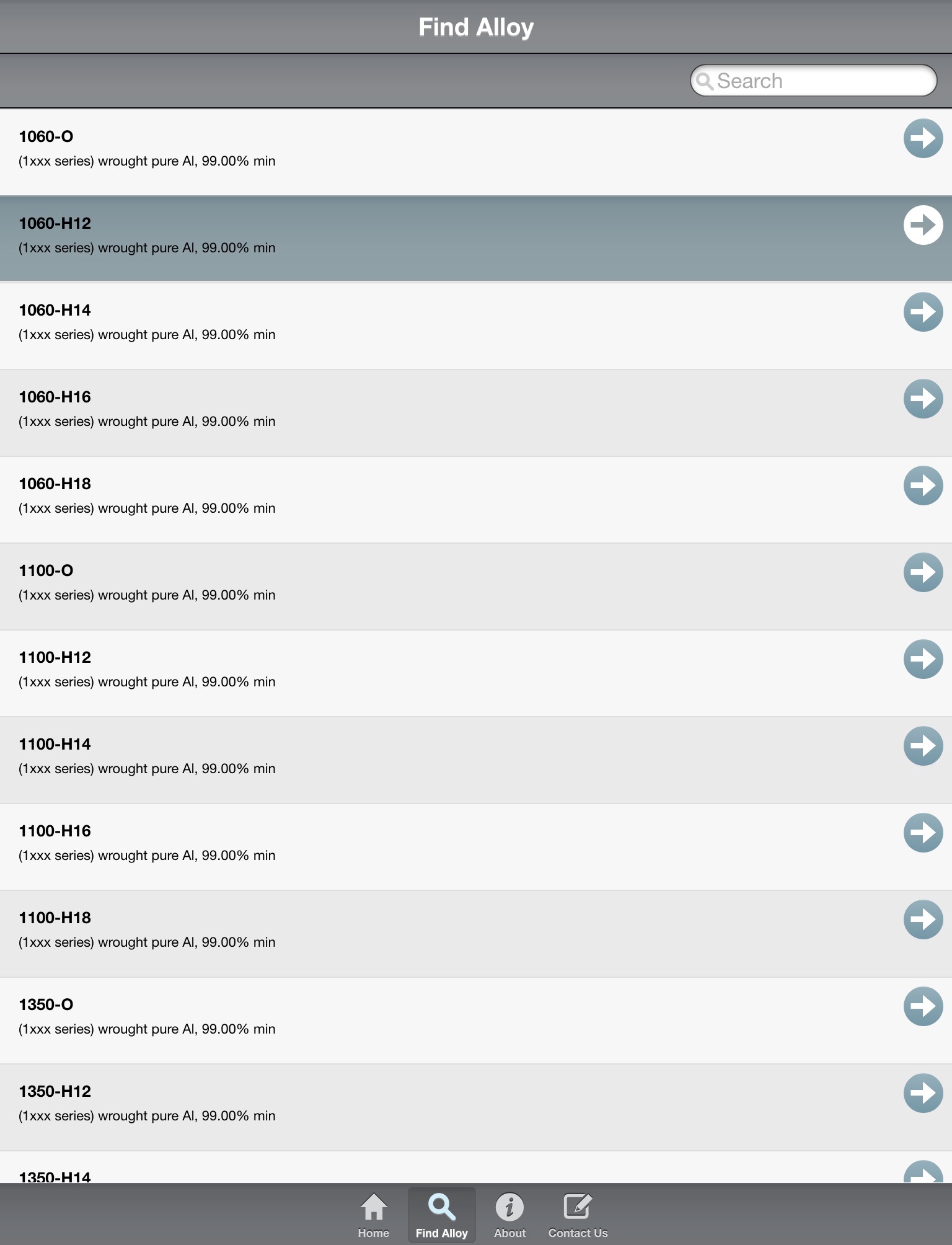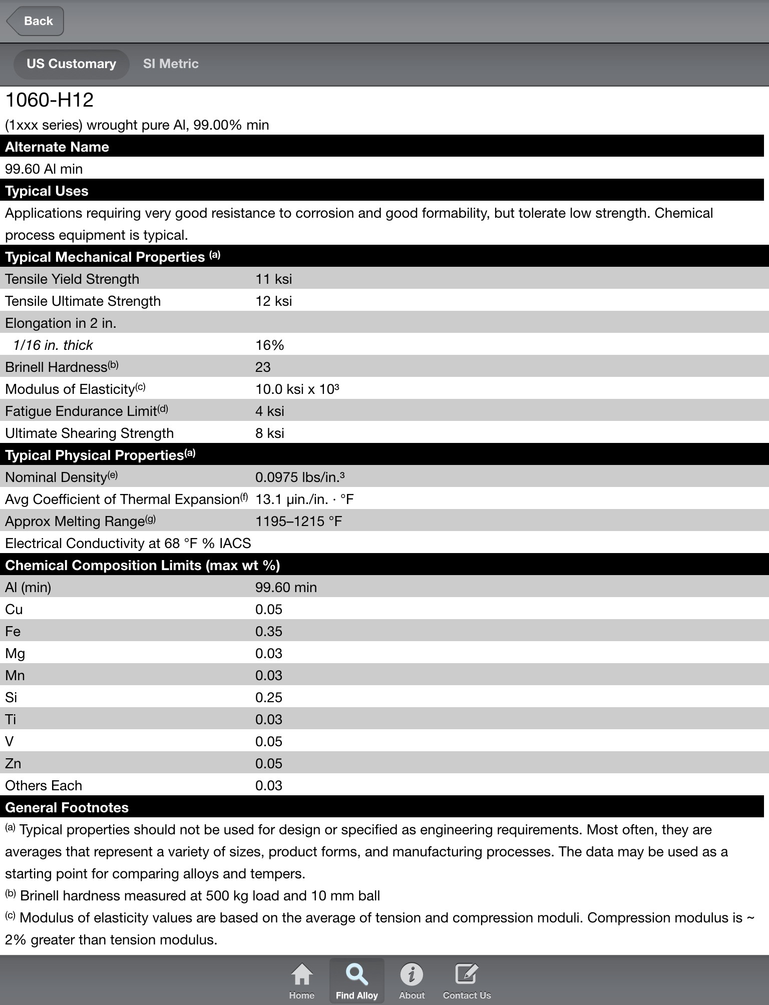 The Aluminum Quick Reference, created by ASM International, provides ready reference data on more than 200 common wrought pure aluminum and aluminum alloy designation-temper combinations. Content includes typical mechanical and physical properties (both US Customary and SI Metric values), chemical composition limits, and typical uses by alloy-temper designation. The app can be used by itself or as a companion to the ASM Alloy Center Database™, which includes property data for more than 100,000 alloys in the US and globally.