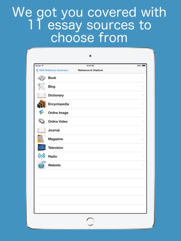 • Includes 11 reference generators. Books, Blog, Dictionary, Encyclopedia, Journals, Magazine, Online Image, Online Video, Radio, Website, and Television sources.