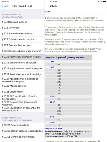 FCC rule text is viewable within the application. All sections can be browsed from the main screen. Additionally, for questions where rule sections have been identified, the rule text can be viewed on the question screen when studying the question pool or reviewing test results.