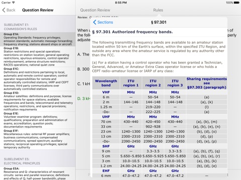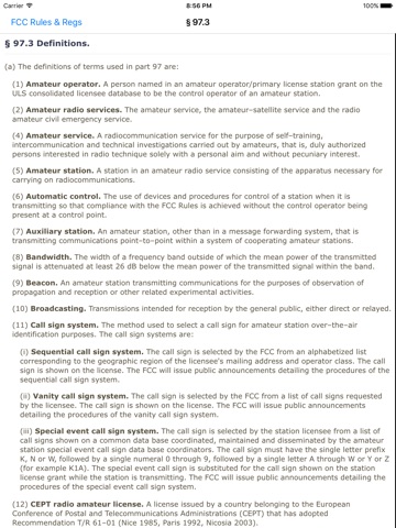 FCC rule text is viewable within the application. All sections can be browsed from the main screen. Additionally, for questions where rule sections have been identified, the rule text can be viewed on the question screen when studying the question pool or reviewing test results.
