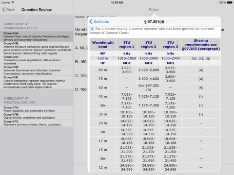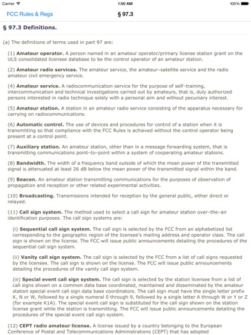 FCC rule text is viewable within the application. All sections can be browsed from the main screen. Additionally, for questions where rule sections have been identified, the rule text can be viewed on the question screen when studying the question pool or reviewing test results.