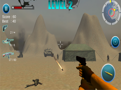 is one of the best sniper shooting and first person shooting on app store , It contain many levels and many weapons for survival , Enemies are full of weapon So be careful they can destroy you by using TANKS , Rocket launcher , Ak-47 , Shot Guns. So are a brave commando to save your border line and be alert from all enemies actions , They can destroy your camps and other rare things , So use Rocket Launcher , ak-47 and shot guns for survival.