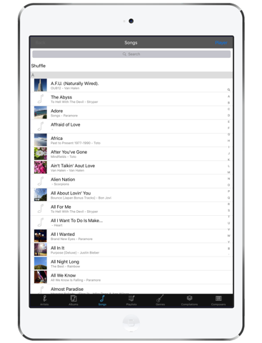 * Playing list, and Selection list by Artists, Albums, Songs, Genres, Playlist, Compilations, Composers