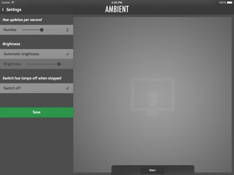 AMBIENT for Hue extracts the average color and the two most dominant colors out of an arbitrary scene in real time (e.g. screen of your TV). You can assign these colors to your hue lamps. This way you can imitate an ambilight TV by continuous scanning of your TV with the camera of your iPhone and placing one or more hue lamps behind your TV.