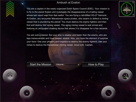 You are a captain in the newly organized Earth Space Council (ESC). Your mission is to fly to the planet Exelon and investigate the disappearance of a trading vessel whose last report was from that sector. You are flying a retrofitted XQ-27 Samurai. At Exelon, you encounter Macedonian space pirates, who swarm to defend a mining vessel that is plundering the planet. You must destroy the enemy fighters and then find and destroy the mining vessel. The aging mining vessel is well armed and features an antiquated cloaking device that allows it to disappear for a few seconds.
