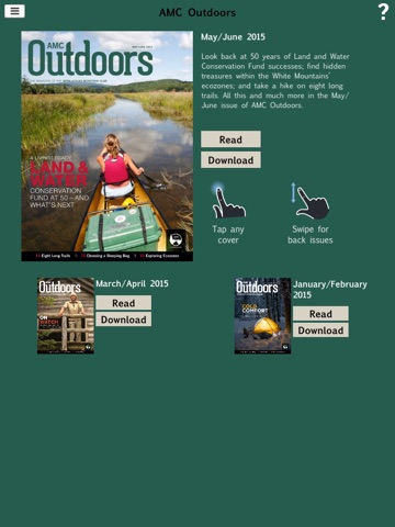 AMC membership is required to access the AMC Outdoors iPad and iPhone app. Existing members can set up a My Outdoors account or update their ID and password at www.outdoors.org/my-outdoors. To join AMC, visit www.outdoors.org/join.