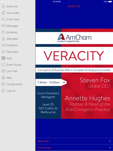 The AmCham event app will allow attendees to browse event programs, create your own personalised agenda, view session information and speaker profiles. Attendees will be able to see who else is at the events, request meetings and send private messages with other attendees as well as staying up to date with live alerts, tweets and a live event feed. You can also give us your live feedback using event surveys and live polls.