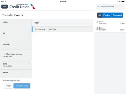 - Access various card services, including: debit and credit card travel notifications and balance-transfer requests.
