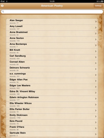 American Poetry is a fully searchable compendium of 5,000 poems by 50 of Americas greatest poets, each poem is displayed in its entirety. The collection contains poems of Robert Frost, e.e. cummings, Edgar Allan Poe, Langston Hughes, Emily Dickinson, Ezra Pound, Walt Whitman, T.S. Eliot, Sylvia Plath, Stephen Crane and many other famous poets.
