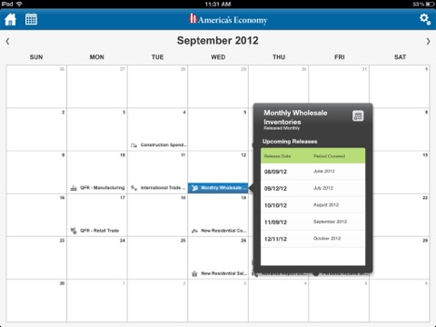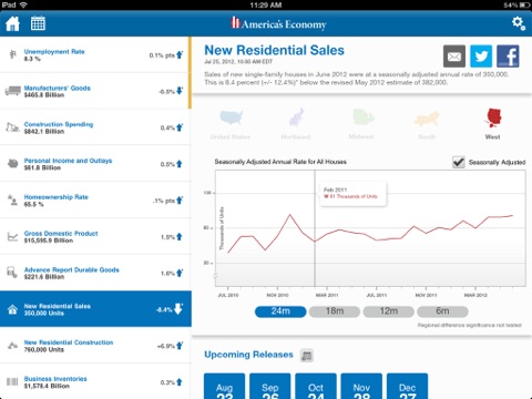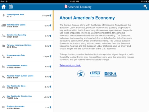 Take the pulse of the U.S. Economy straight from your phone. The America’s Economy app provides real-time updates for 21 key economic indicators released from the U.S. Census Bureau, Bureau of Labor Statistics, and Bureau of Economic Analysis. Key economic measures on employment, manufacturing, international trade, retail sales, and residential construction and sales allow those who follow the U.S. economy to be the first to see whether the indicator has gone up or down since the previous report, and trends over time.