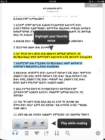 It is an excellent beginning. Some part could not play saying error. I enjoyed the part I heard. I hope you will correct it soon. Here are other suggestions. I have many bible versions with with many audios with different voices. You can read the bible while listening the same part. It does it automatically. You can continuously listen to a book or books. Yours closes after the chapter chosen is read. 1. Have more bible versions such as Oromo bible with Amharic letter (old version) and oromo in Latin (kube ones) and different ETHIOPIAN language versions available. Have bundle of them together with audio. Then have bundle price. That would allow one to go to menu and check language then choose book or chapter with audio option if available. 2.have search using key word 3.have more font to appeal to older people who can not read fine prints. 4. Add bible commentaries and dictionaries. 5. Include study guides I will send you more when I get time God bless you