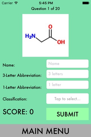 Having trouble memorizing those pesky amino acids? This is a common problem for many people. Luckily, this app may help you! This ad-free app will test your knowledge of amino acid structure, naming, abbreviations, and classification. Additionally, it will give you a score out of 80. Your high score is saved so that you can monitor your progression and continuously improve.