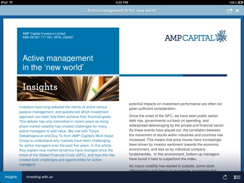 The AMP Capital app is designed to provide you with the latest investment and market information direct to your iPhone, iPod touch or iPad: