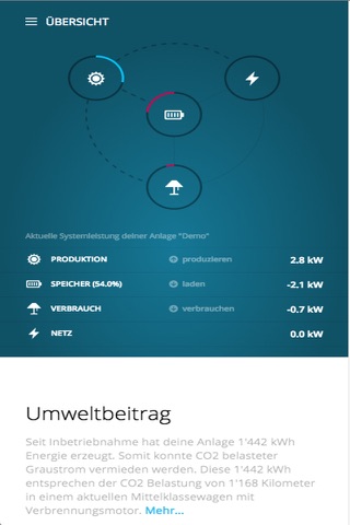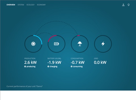 Das User Interface zeigt dir, was deine Photovoltaikanlage zu welchem Zeitpunkt produziert hat und wie viel Energie du verbraucht, in der Batterie zwischengespeichert oder allenfalls ins Netz eingespeist hast. Alle Stromflüsse und gesteuerten Geräte erscheinen animiert auf der Startseite.