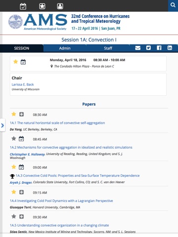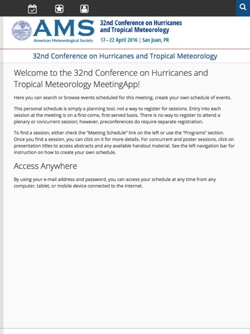 The 32nd Conference on Hurricanes and Tropical Meteorology will be held from April 17th - April 22nd in San Juan, Puerto Rico. Login to view Sessions and Papers saved as favorites. View schedules, locations, floor plans, and people. Attendees will now be able to facilitate their experience at the meeting using the mobile app.