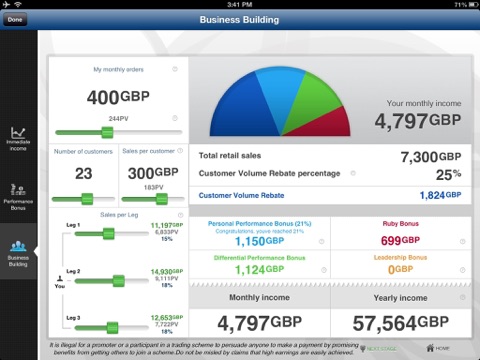 Try the app to see how selling products and business building can impact your potential monthly and yearly income.