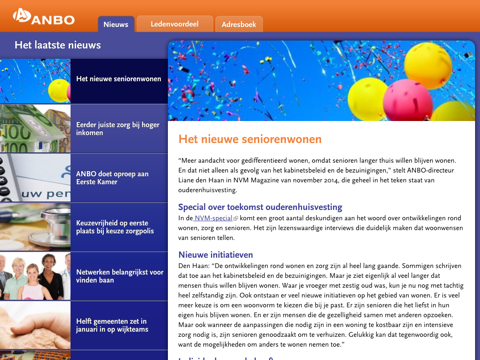 ANBO heeft de dienstverlening de laatste jaren fors uitgebreid. En die dienstverlening wordt nu ook ontsloten via een eigen ANBO App. Zo hebben leden al het voordeel en korting én het laatste ANBO-nieuws zó in hun broekzak. ANBO is de eerste seniorenorganisatie met een eigen app. ANBO-directeur Liane den Haan: “Wij winnen op relevantie omdat we onze vereniging hebben aangepast aan de moderne maatschappij. Moderne ICT-toepassingen om leden en vrijwilligers te ondersteunen horen daar vanzelfsprekend bij. Verrassend misschien, maar senioren maken nu al op grote schaal gebruik van nieuwe media.”
