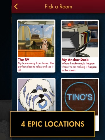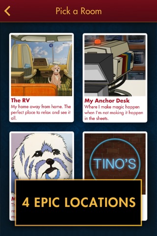 • 4 different locations: Rons shag-tastic RV, The News Teams new NYC apartment, the 24 hour newsroom, and Tino’s Jazz Bar