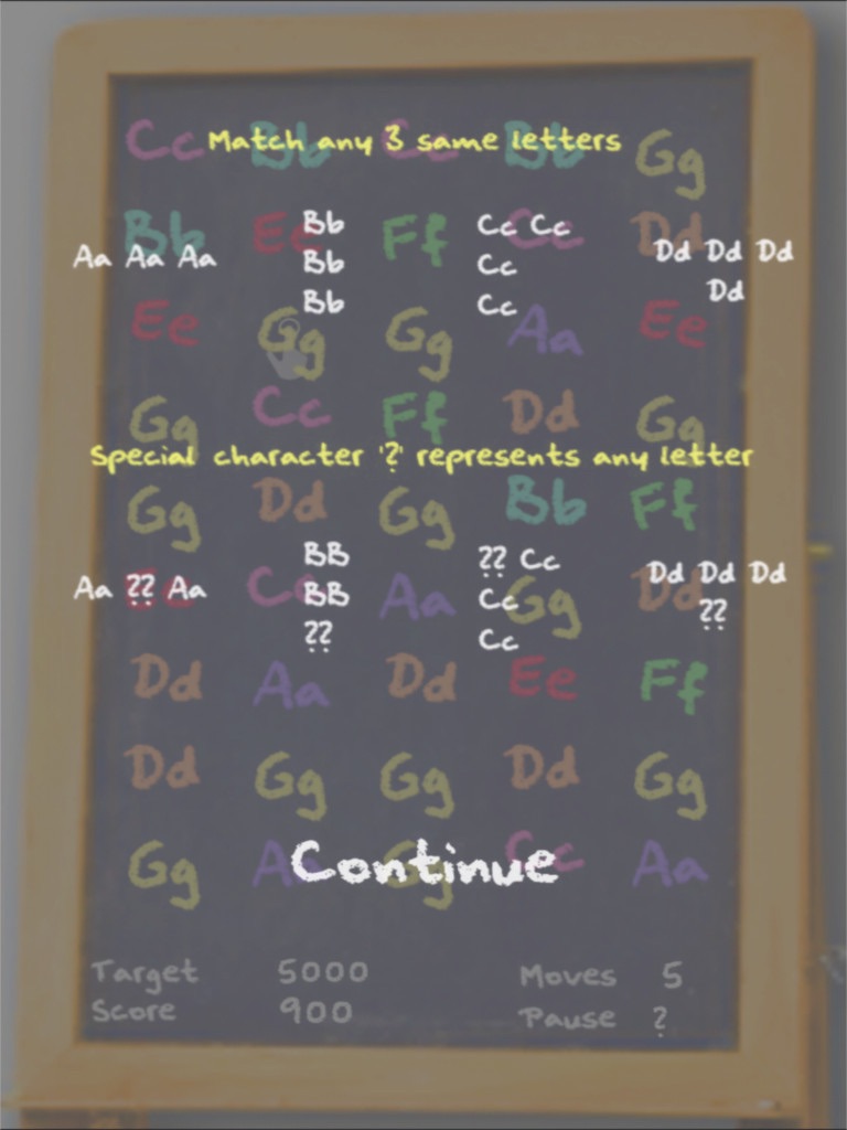 2. Match 3 or more same letter (in horizontal, vertical, L-shape, or T-shape form) to get points.