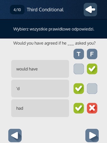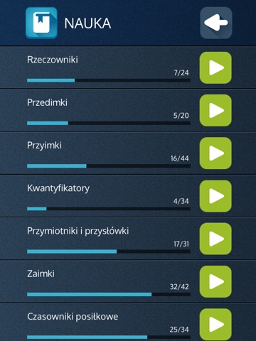 W opcji Nauka materiał podzielony jest na 33 zagadnienia gramatyczne.