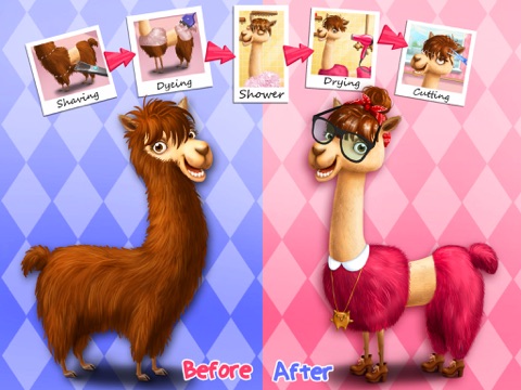 Little pet Llama is so soft and woolly but summer is coming and she wants to be prepared for hot sunny days! Follow the lines to make the right cuts, apply hair dye, shower and dry little Llama. Fun dress up is what’s next: mix and match shoes, glasses, hats, necklaces, scarves and shoulder bags to complete the new looks!