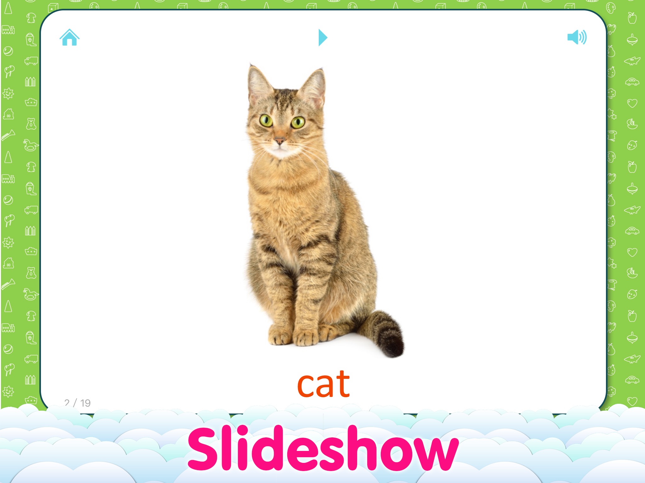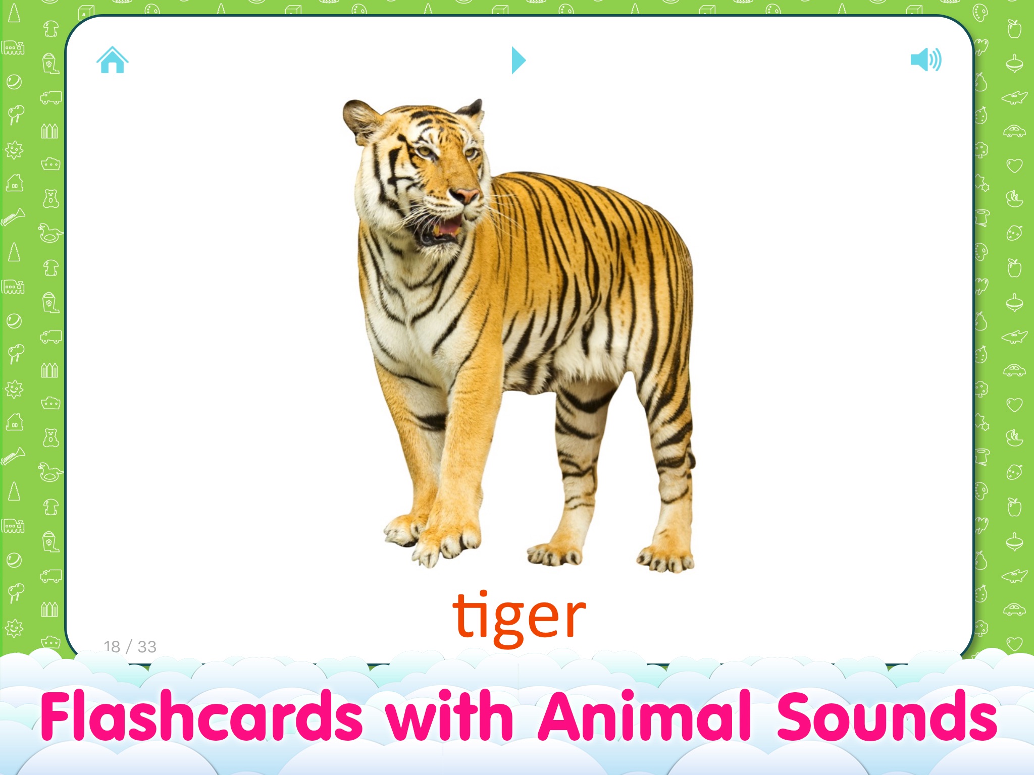 The application has sound flashcards with bright images which are divided into topics and learning game «Find a Picture».