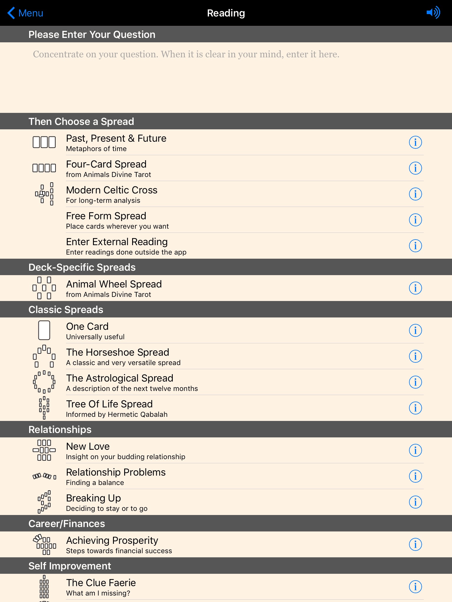 Lisa Hunts artwork drew me in, while the well designed app makes this a practical tool for my own exploration as an artist. The explanations of the cards, the spreads and the symbols are concise, leaving me free to wander on my own.