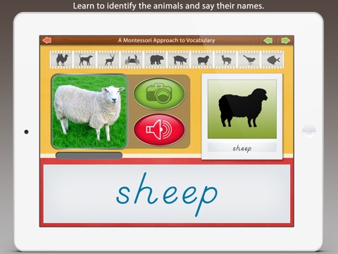 In the Montessori Classroom several activities exist to assist children to increase their vocabulary. This application will help children to identify and learn the names of the animals.