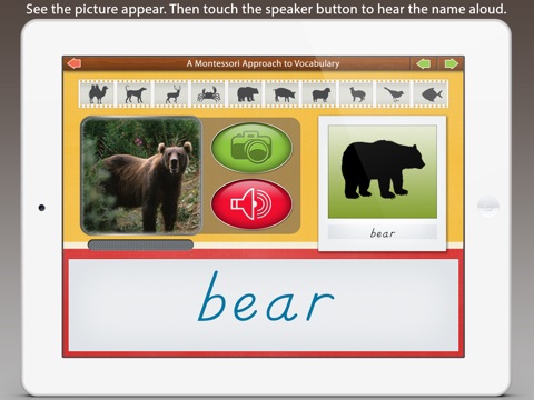When the speaker button is touched the name of the animal is played aloud for the child to hear, helping them to learn the correct pronunciation of each name.